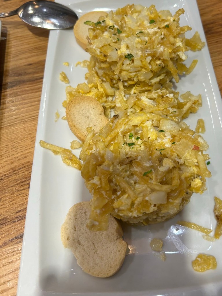 Having a Spaniard with us for lunch meant we went off the tourist trail to a large bar full of locals. He helped us choose a delicious table of tapas which included some stunning tuna in a light pepper salsa, sliced pork in whisky sauce served with chips and a revuelto de bacalao – shredded potato and cod scrambled with eggs! Looked amazing and was delicious.